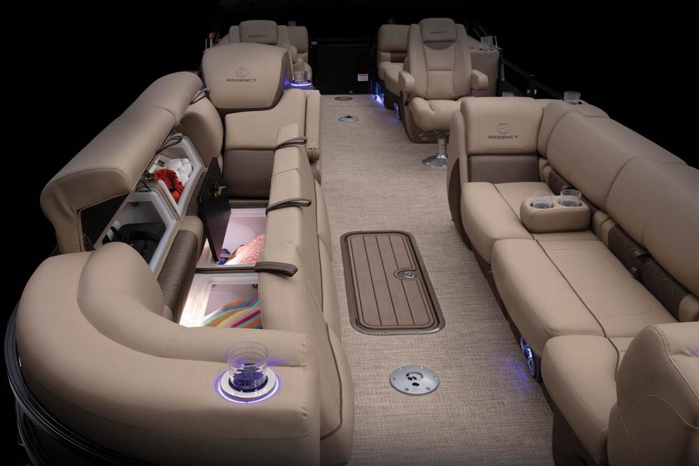 Lighted cupholders and LED foot lights add ambiance to evening cruises while bow-to-stern exterior lighting signals your presence in artful fashion. Exclusive TRACK FORMED™ fencing delivers solid, rattle-free peace of mind and head-turning appeal, with your choice of finish to match the powdercoated logs.