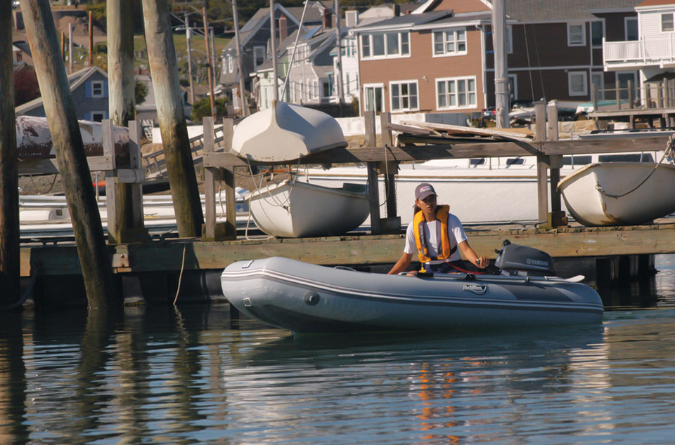 Achilles LSI-290E inflatable boat is a popular sized model and is available in both light grey fabric and white fabric. With a hypalon high-pressure air deck, this boat offers convenience and durability for the long run. The use of an eight horsepower outboard would allow this boat to plane with 2-3 persons, but the tender can support up to 4 persons or 1,120 pounds.