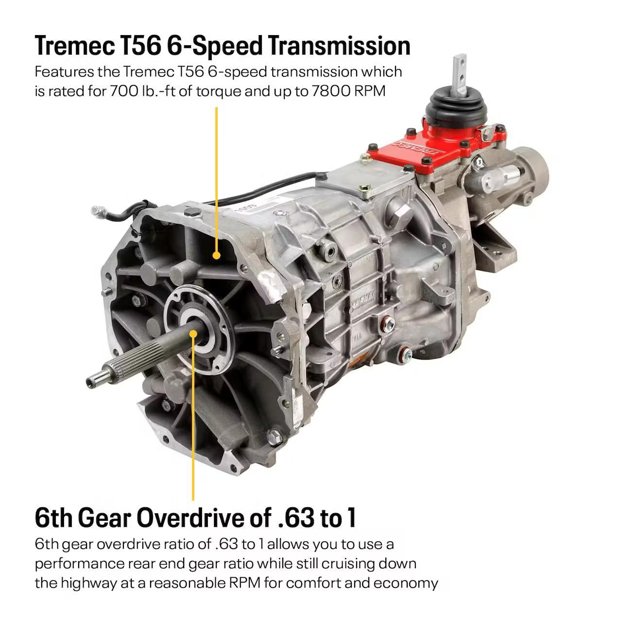 Includes 6-speed Tremec T56 manual transmission rated for 700 lb-ft of torque