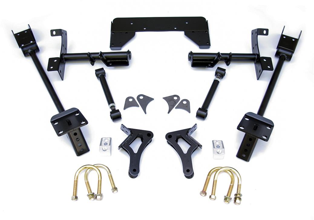 Includes front upper control arms and bolt-in 4-link system.