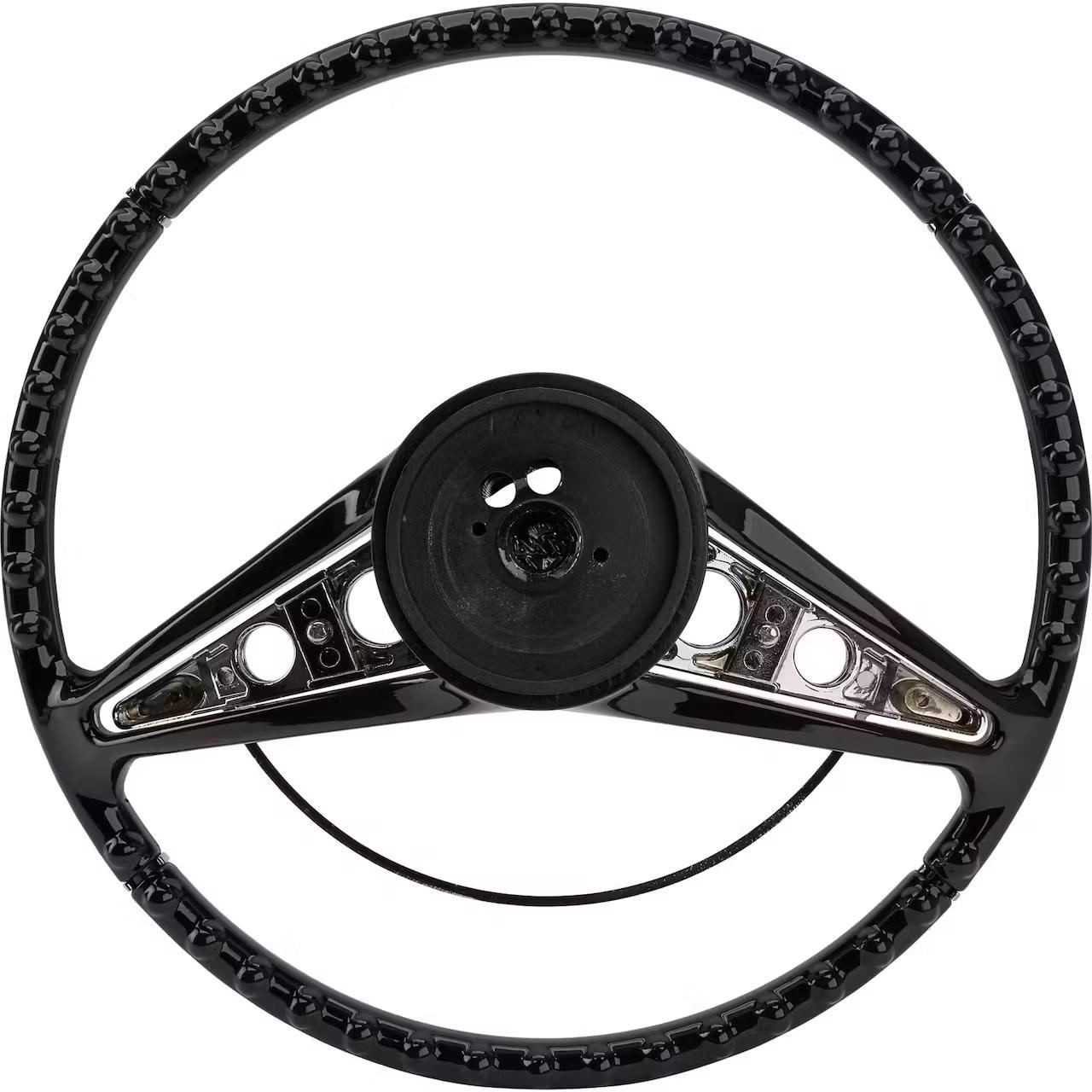 Made to fit to the original steering column using all the original horn, nuts, and directional parts. The American-Retro wheel comes complete with a chrome horn ring and a center cap. Installation is easy- just bolt it on! Finished in black. For other colors, simply paint to match your vehicle.